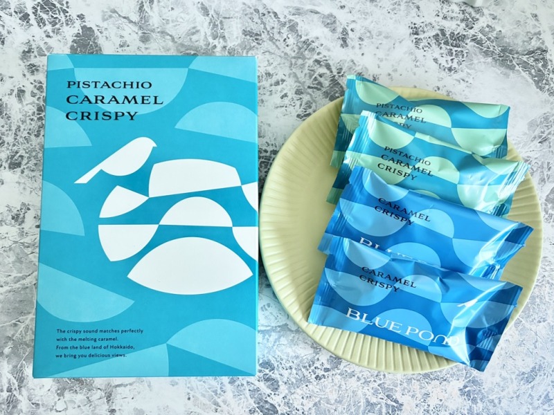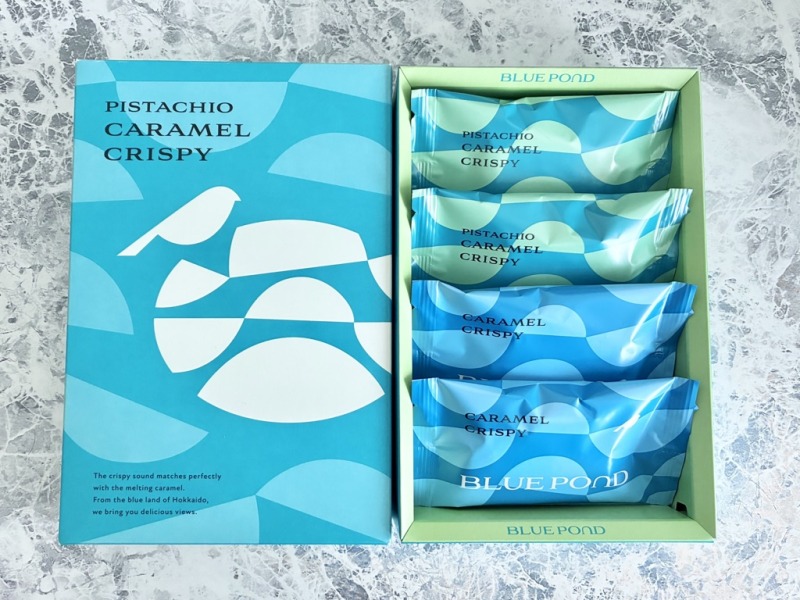 ブルーポンドは、製法にこだわり、北海道でしか味わえないスイーツを生み出したキャラメルミルクスイーツ専門店。北海道産生乳を使ったキャラメルソースとザクっと食感がクセになるクリスピー生地が特徴のスイーツなんだそうです!早速開封してみます。