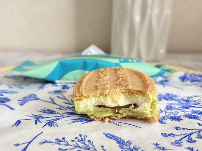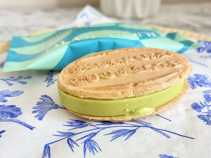 ピスタチオキャラメルソースがサンドされており、断面は美しいピスタチオカラー。「キャラメルクリスピー」との味の違いも気になります。
